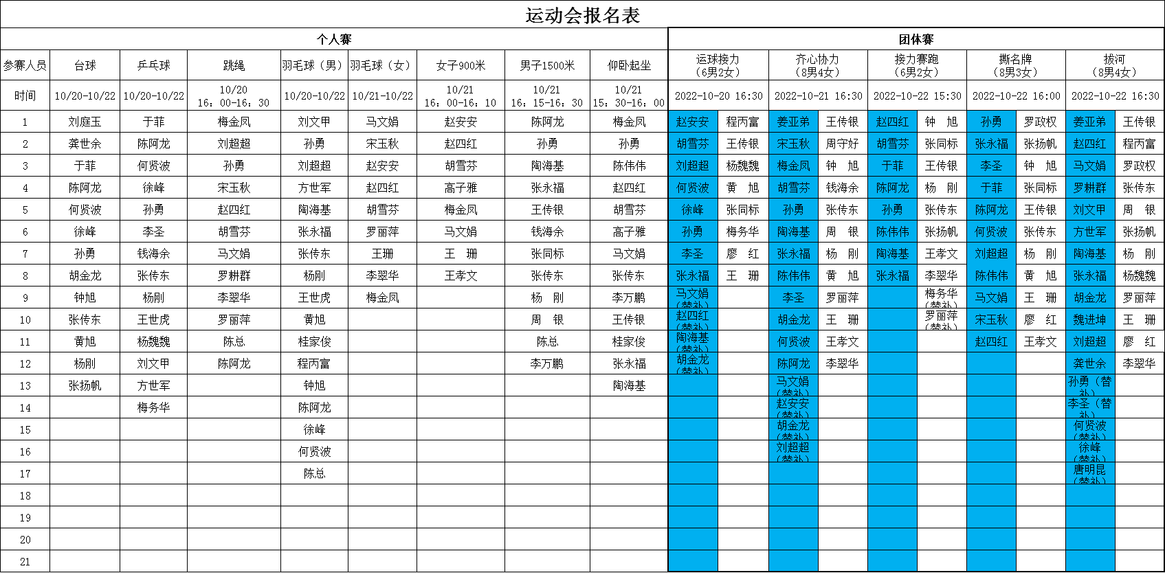金秋送爽、丹桂飄香,在這秋高氣爽的美好時(shí)節(jié),我們滿懷喜悅的心情迎來了公司2022年度秋季職工運(yùn)動(dòng)會(huì)。本屆運(yùn)動(dòng)會(huì)分個(gè)人賽、團(tuán)體賽,自10月20日至22日共持續(xù)3個(gè)下午,比賽項(xiàng)目包括乒乓球、羽毛器(男子、女子單項(xiàng))、臺球、跳繩、仰臥起坐、女子900米,男子1500米長跑8項(xiàng)個(gè)人賽,還有齊心協(xié)力、運(yùn)球接力、女子接力賽、男子接力賽、撕名牌、拔河共6項(xiàng)團(tuán)體賽。在歷屆運(yùn)動(dòng)會(huì)的賽程、賽項(xiàng)上都增加了新的活動(dòng)亮點(diǎn),從參賽名單上不難看出,全體協(xié)普家人的熱情和參與度都異常高漲。